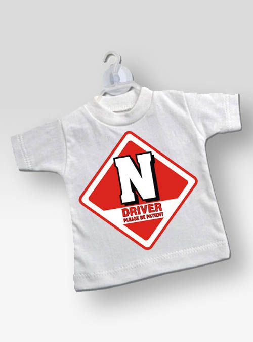 Mini t-shirt λευκό με δυνατότητα εκτύπωσης sublimation, κοντό μανίκι και στάμπα New Driver Please Be Patient. Περιλαμβάνεται μικρή κρεμάστρα με βεντούζα. Το άνω είδος διατίθεται και με το σχέδιο της επιθυμίας σας.